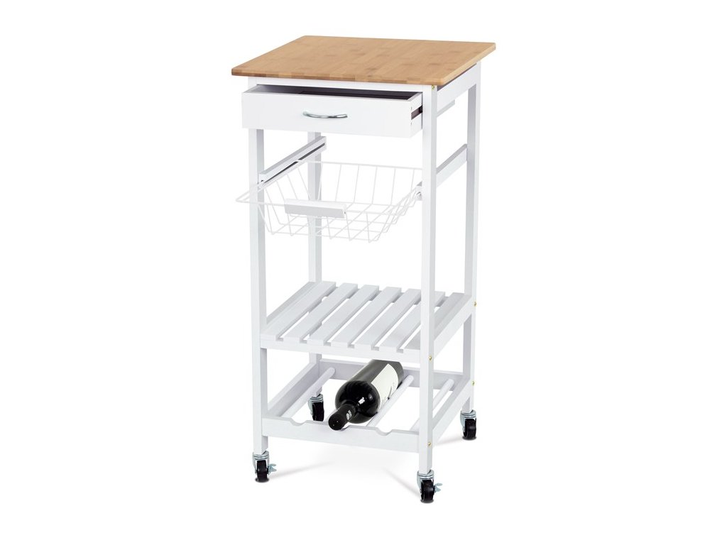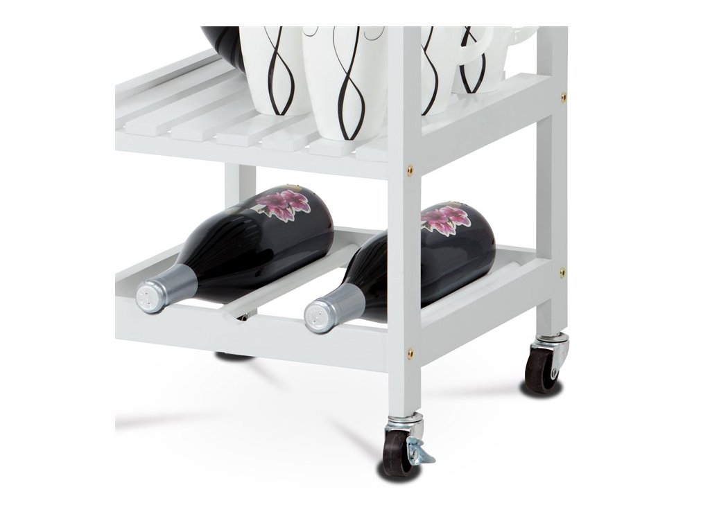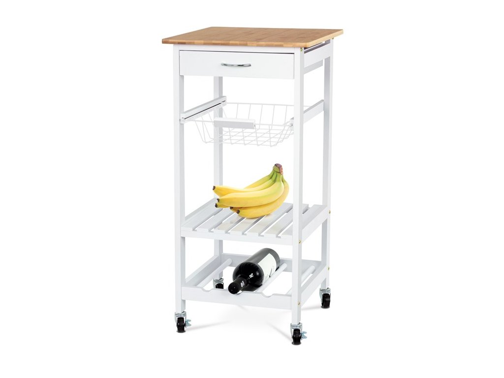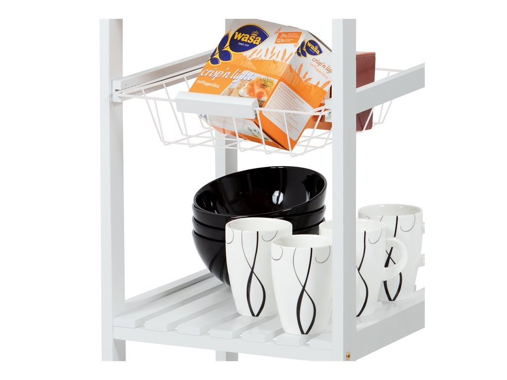 Servírovací stolek DR-044 je praktický a elegantní doplněk, který vám usnadní nejen servírování, ale poslouží i jako mobilní úložný prostor – nejen do kuchyně. Tento víceúčelový vozík nabízí tři patra úložného prostoru: ve spodním najdete držák na tři lahve, střední patro tvoří pevný rošt vhodný pro těžší předměty a horní část je vybavena výsuvným drátěným košem s dřevěnou úchytkou pro snadný přístup k uloženým věcem.