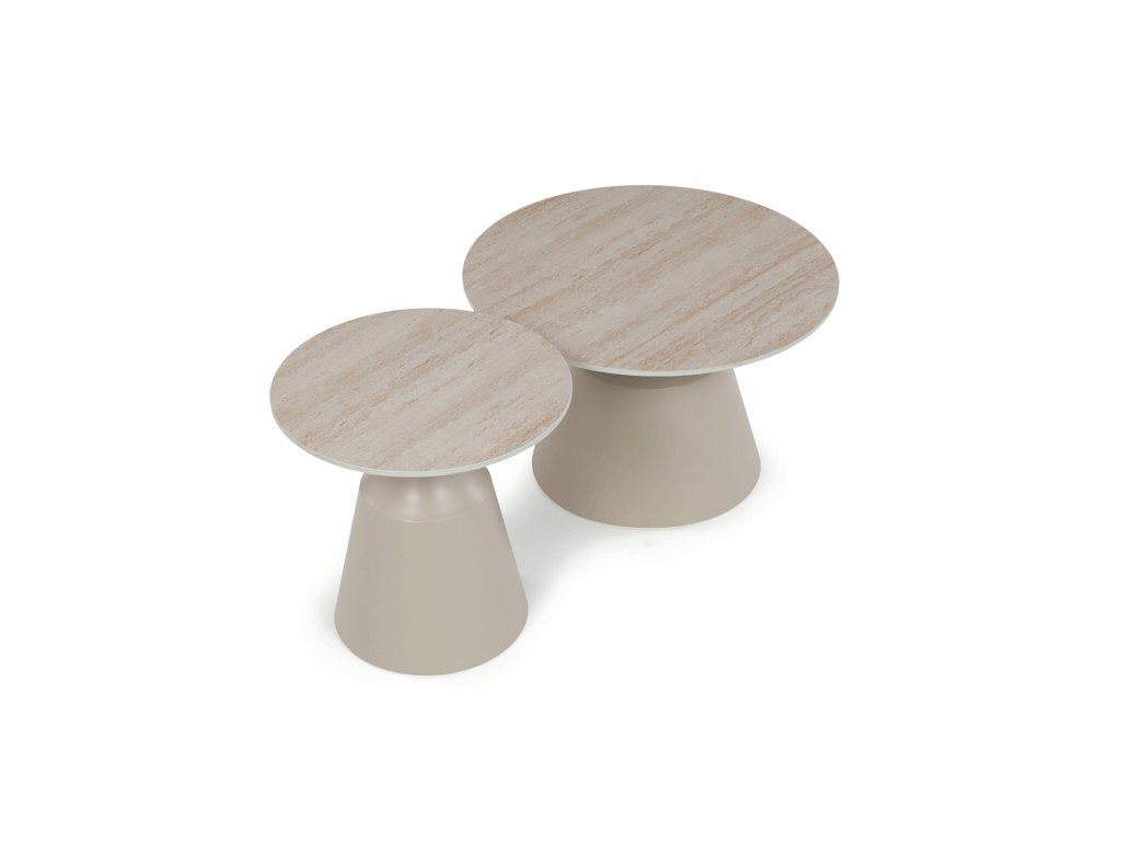 Větší stůl má průměr 70 cm a výšku 43,5 cm, menší pak průměr 50 cm a výšku 48,5 cm. Díky rozdílným rozměrům lze stolky variabilně uspořádat, ať už vedle sebe, nebo samostatně v různých částech místnosti. Kovová konstrukce zajišťuje pevnost, stabilitu a bezpečné používání na všech typech podlah.