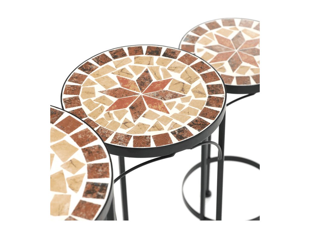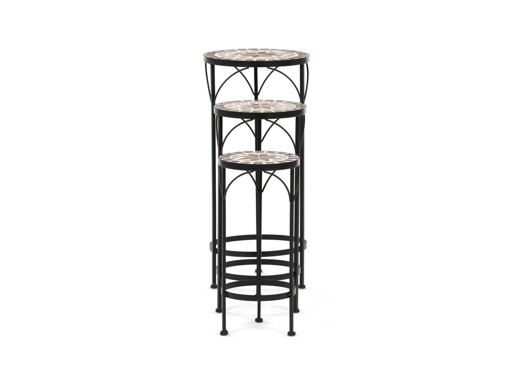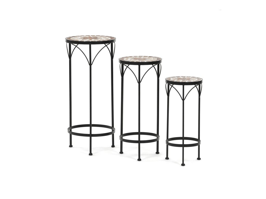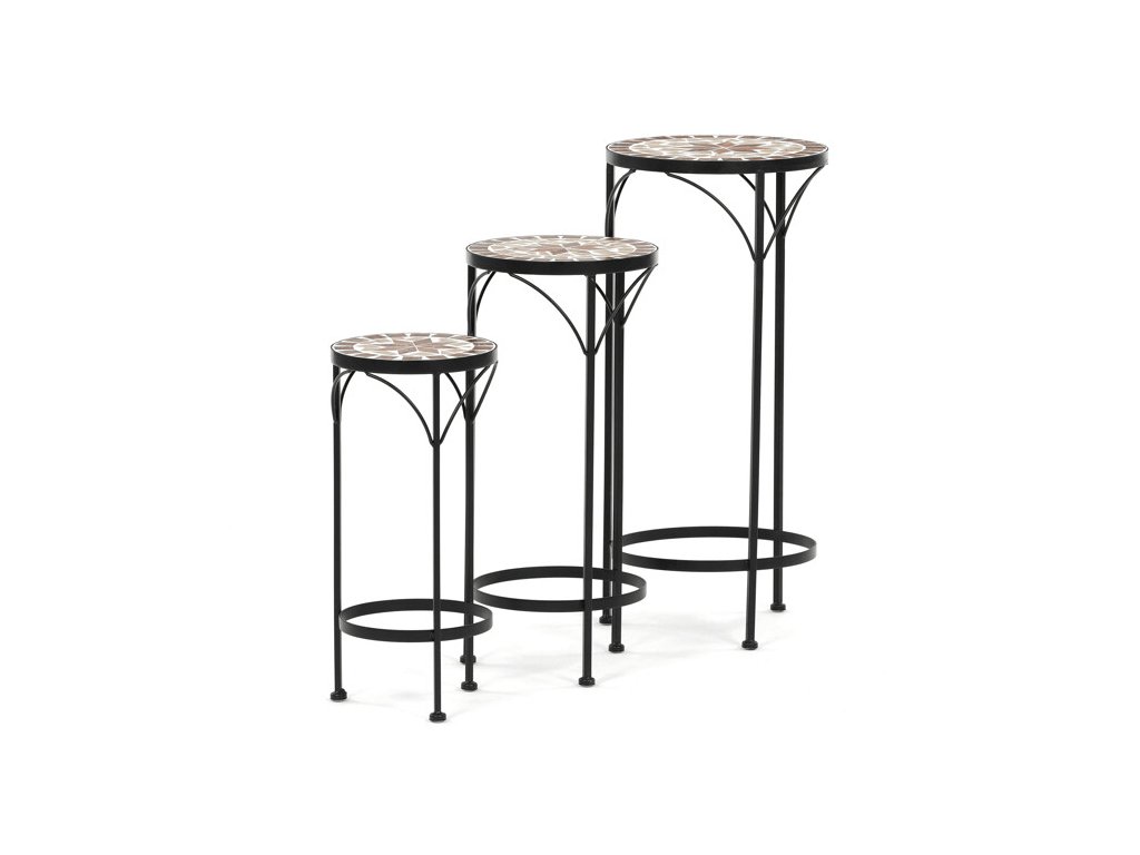 Sada tří stojanů na květiny US1601 kombinuje pevnou kovovou konstrukci s keramickou deskou zdobenou krémovou mozaikou, která vytváří jemný a elegantní dekorativní prvek. Spojení kovu a keramiky zajišťuje stabilitu, odolnost i dlouhou životnost.