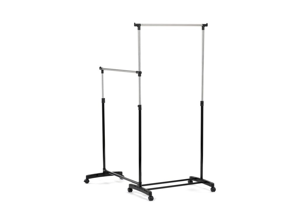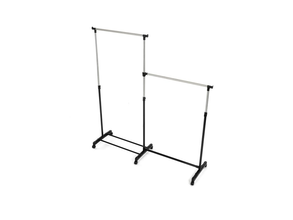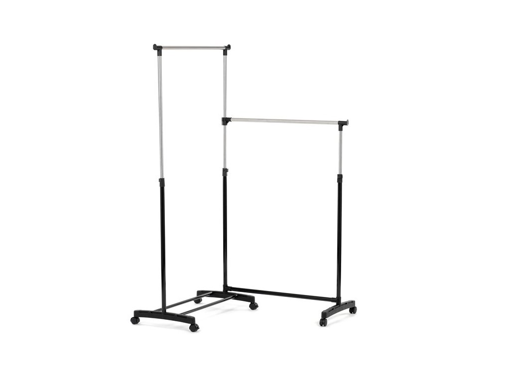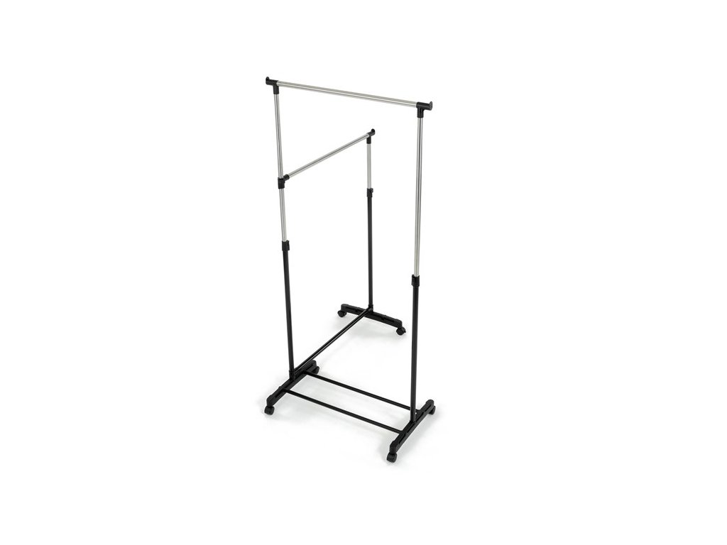 Dvojitý stojan na šaty GD-174 BK značky Autronic je ideálním řešením pro maximální využití úložného prostoru. Stabilní kovová konstrukce v kombinaci s kolečky umožňuje snadnou manipulaci a vysokou nosnost. Dvě prostorné tyče poskytují dostatek místa pro zavěšení oblečení, ideální pro šatny, ložnice či předsíně. Minimalistický design v černém provedení se snadno přizpůsobí jakémukoliv interiéru. Díky své praktičnosti a flexibilitě je tento stojan perfektní volbou pro každodenní použití i sezónní organizaci šatníku.