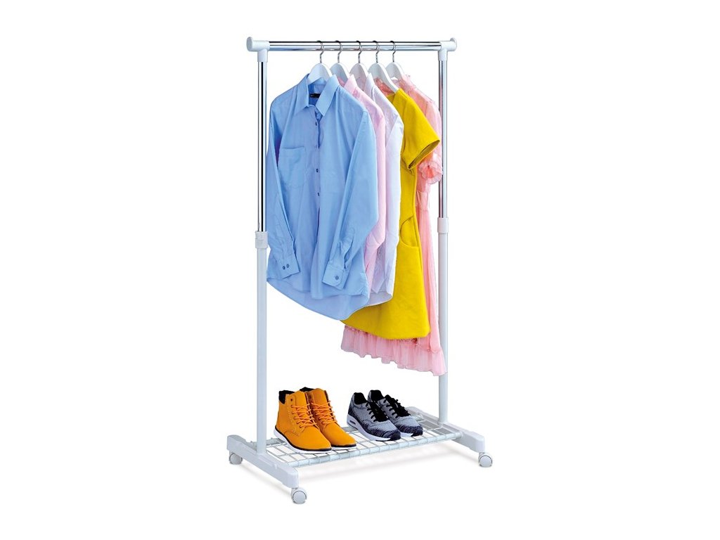 Stojan na šaty jednoramenný ABD-1210, s pojezdem bez aretace a s praktickým odkladačem na boty, krabice, apod. tvořeným dvěmi kovovými spojovacími trubkami spojenými drátěnou sítí. Provedení chrom / černá nebo bílá barva kovu a plastu.