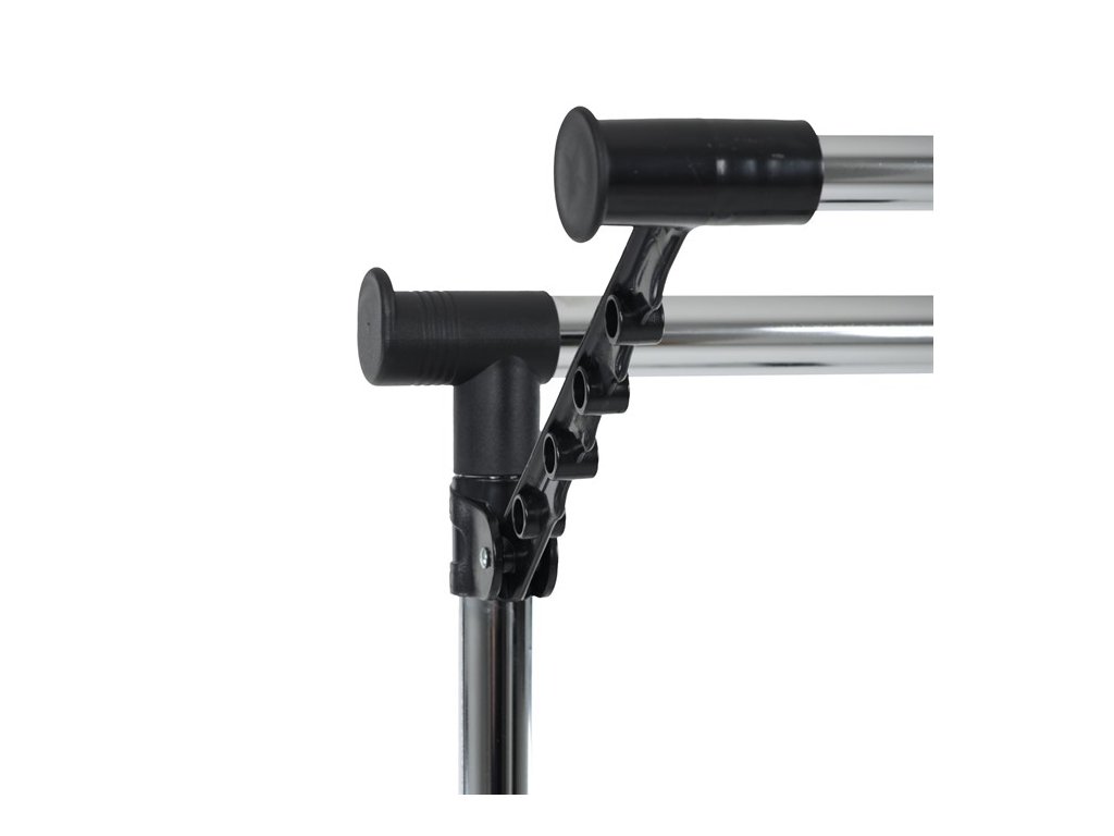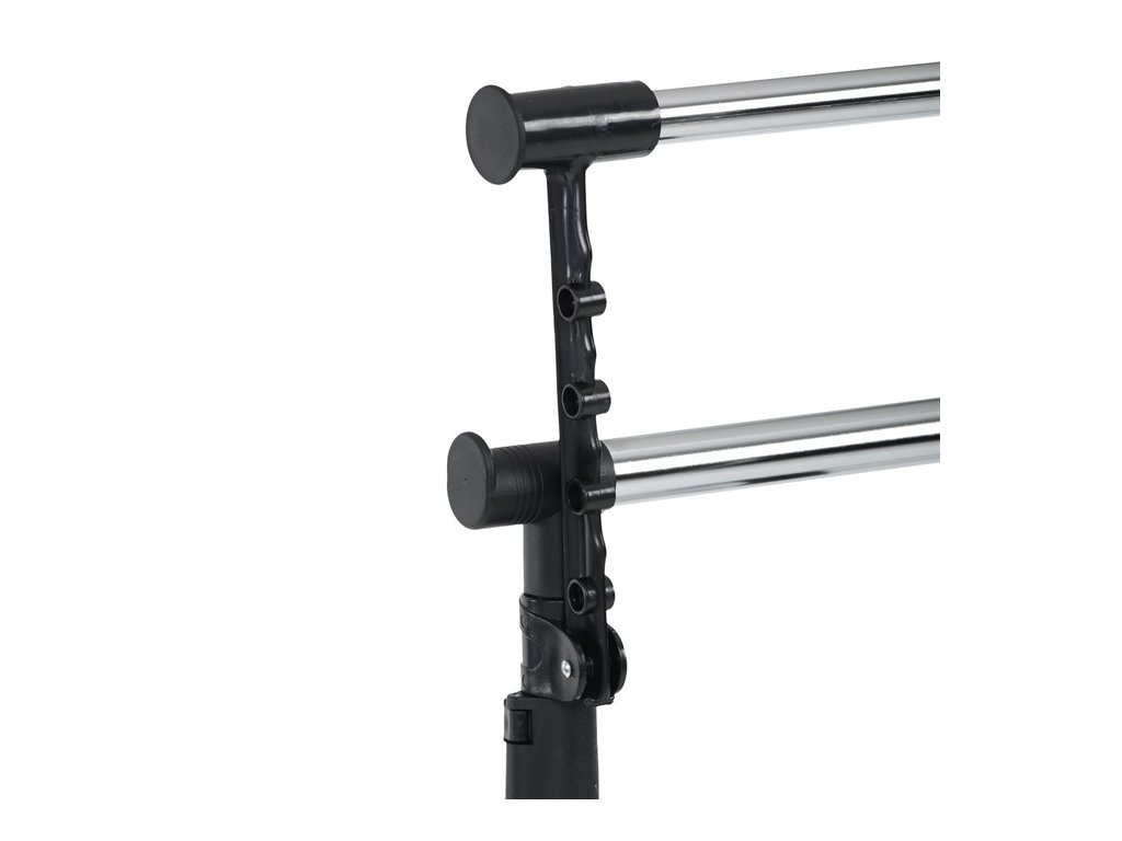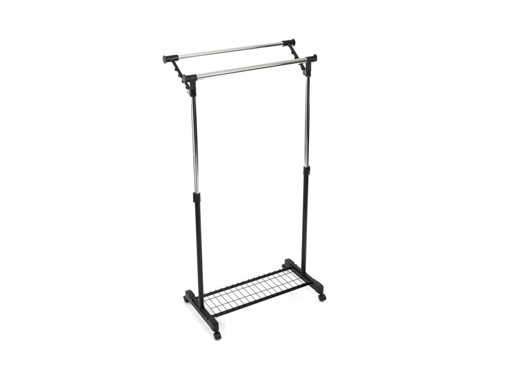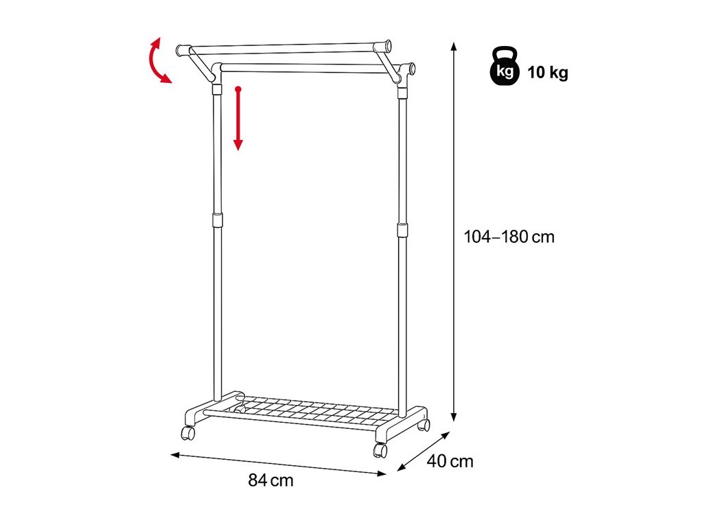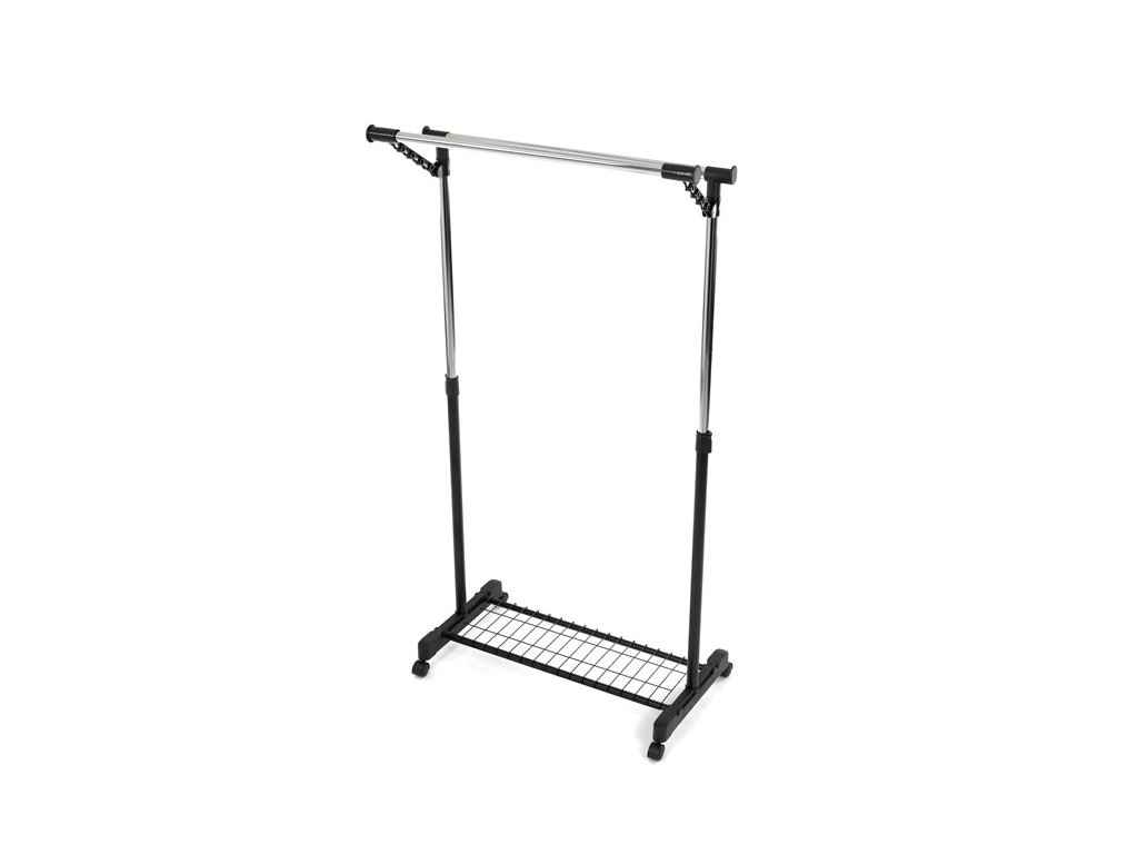 Výškově nastavitelná tyč se přizpůsobí různým potřebám, dolní mřížkovaná police nabízí prostor pro boty nebo tašky. Díky kolečkům je manipulace se stojanem snadná a pohodlná.
