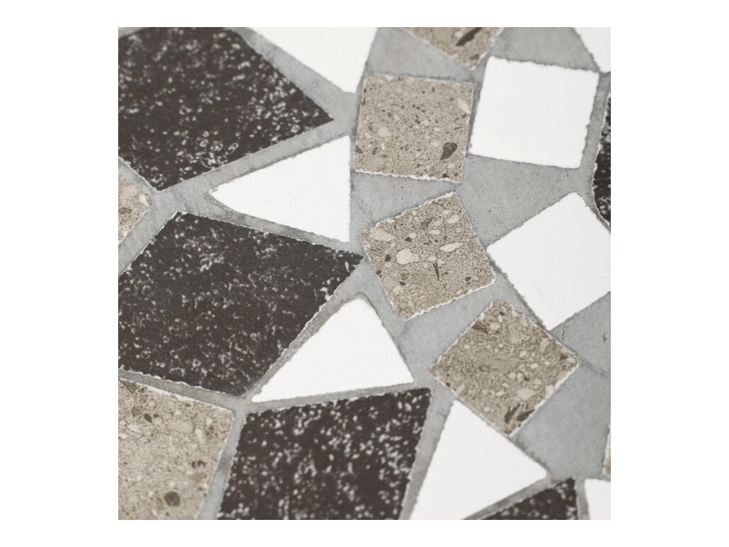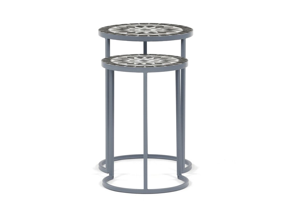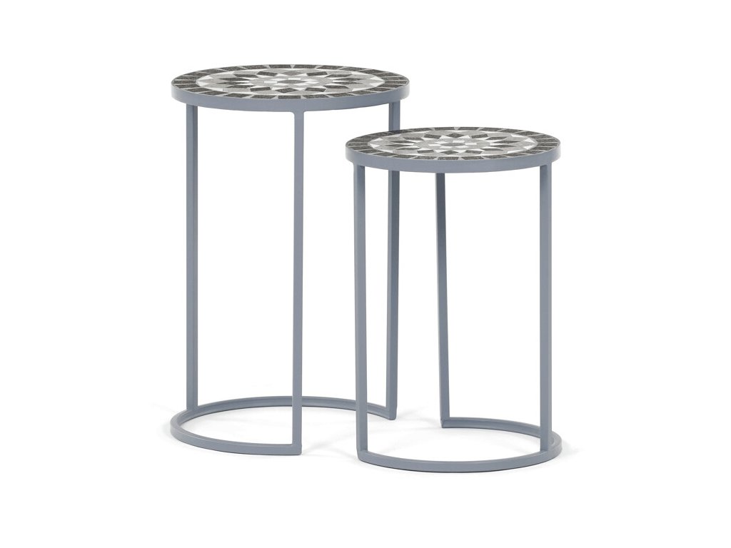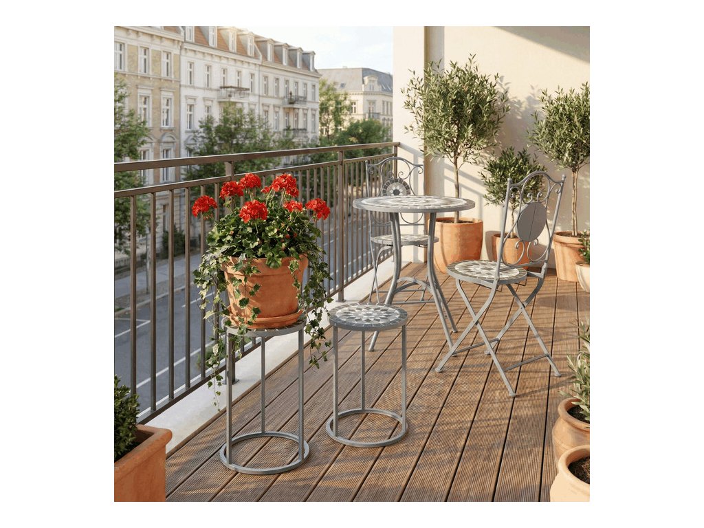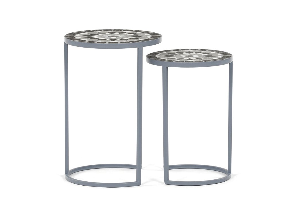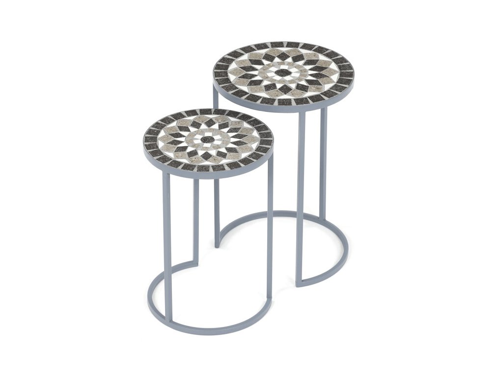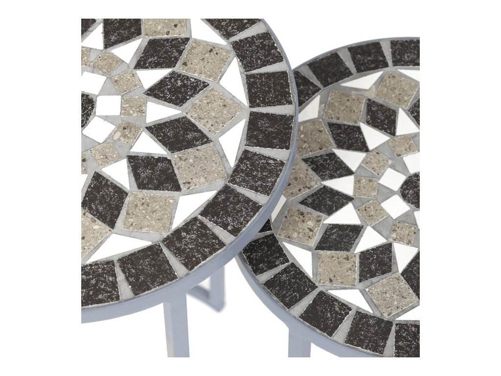 Sada dvou stojanů na květiny US1501 kombinuje pevnou kovovou konstrukci s dekorativní keramickou deskou s mozaikovým vzorem. Kulaté desky zdobí geometrický motiv v přírodních odstínech šedé a bílé, který dodává stojanům výrazný a elegantní vzhled.