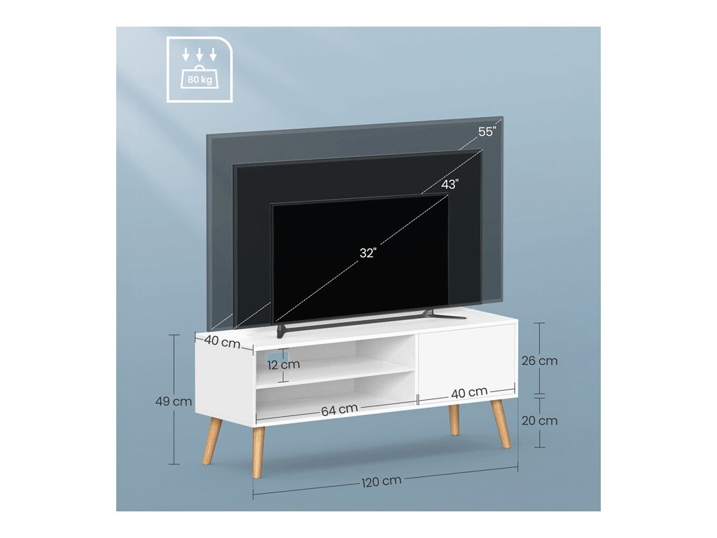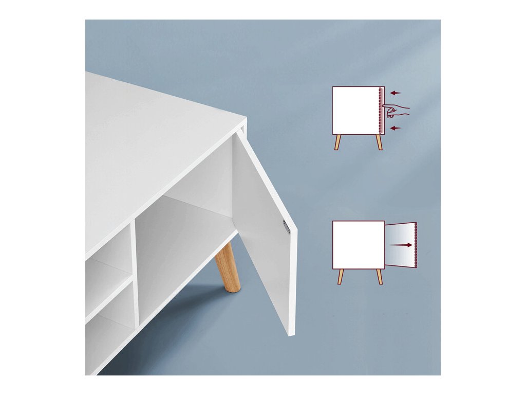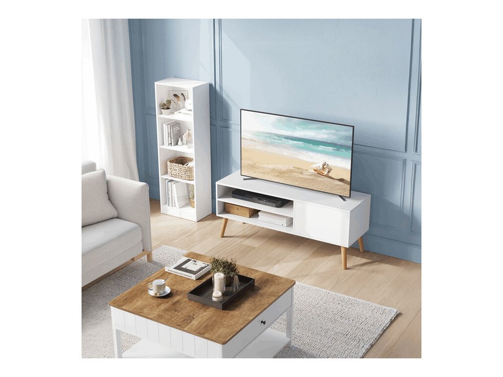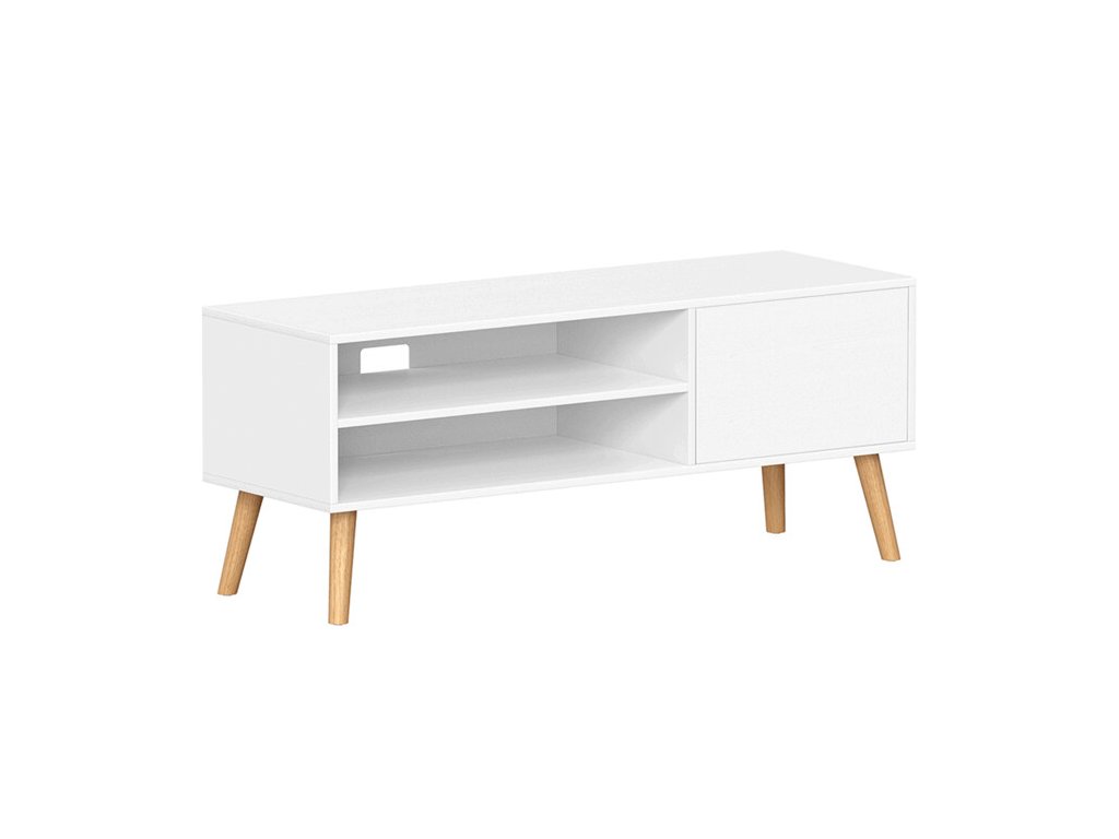 TV nebo konferenční stolek o šířce 120 cm je vyroben z MDF desky v bílé barvě s hladkým, snadno udržovatelným povrchem. Stabilní nohy z masivního kaučukového dřeva dodávají stolku pevnost a příjemný přírodní akcent, který kontrastuje s moderním bílým korpusem.