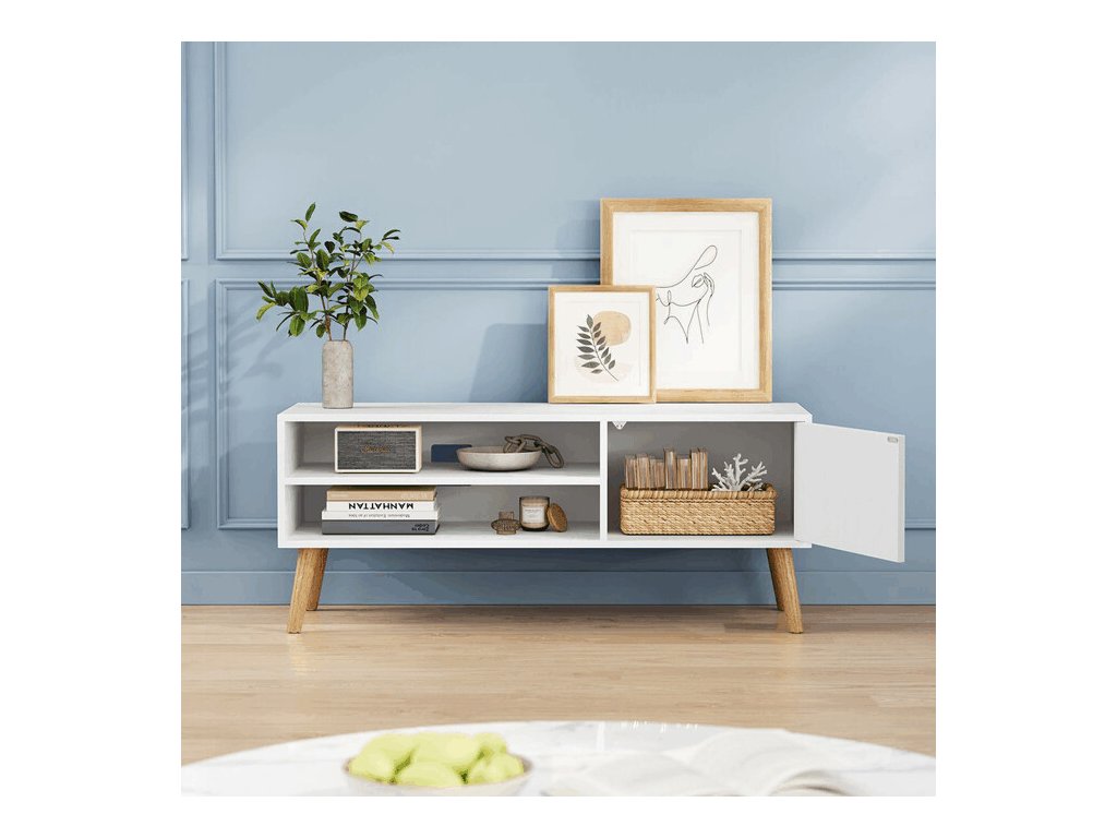 Stolek nabízí praktický úložný prostor rozdělený na dvě otevřené police a jednu uzavíratelnou skříňku, což umožňuje přehledné uspořádání elektroniky, knih i doplňků. Otevřená část je doplněna průchodkou pro kabeláž, která usnadňuje zapojení zařízení a udržuje pořádek. Díky čistému designu a kompaktním rozměrům je stolek vhodný do moderních obývacích pokojů.