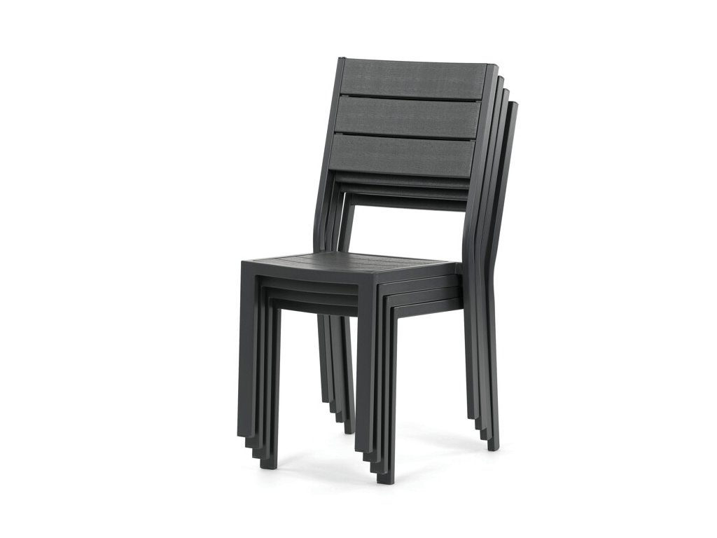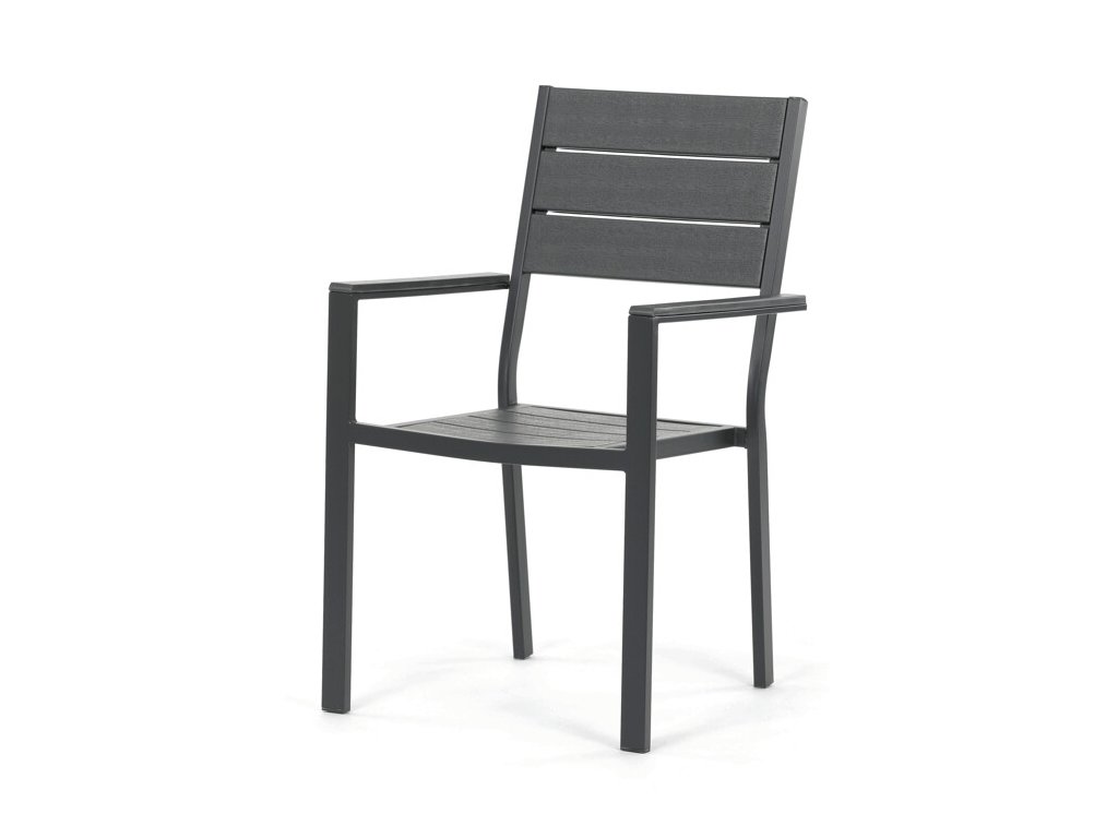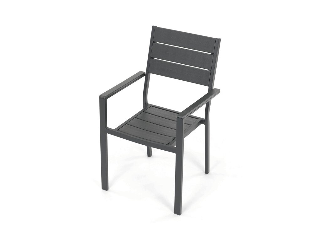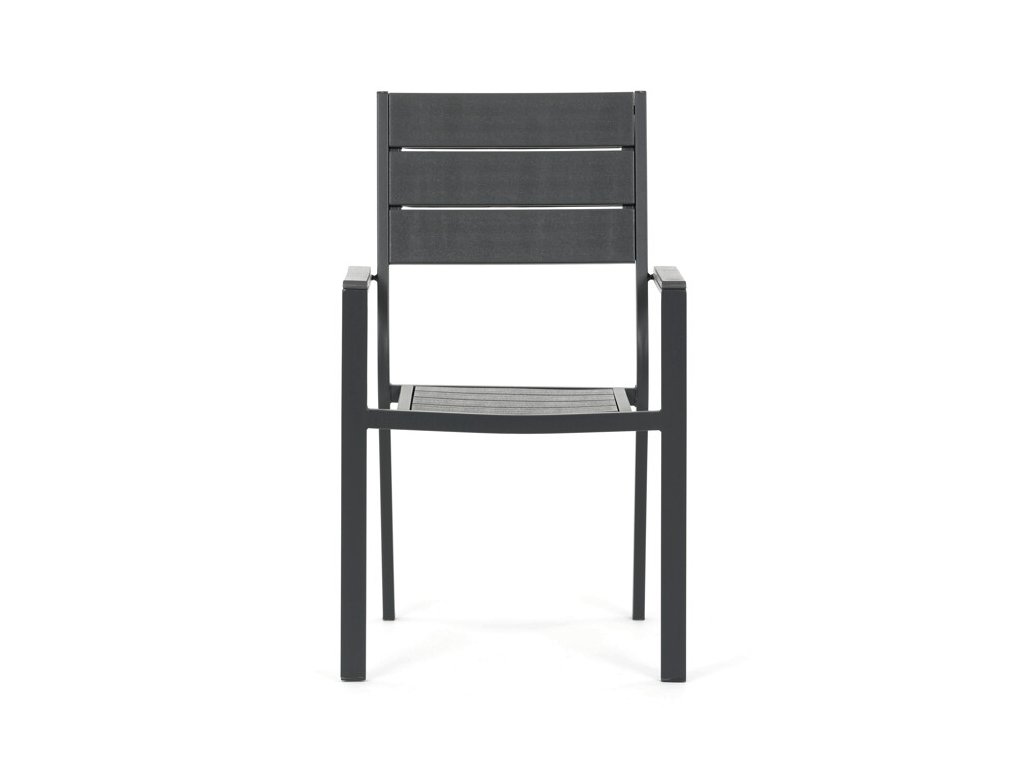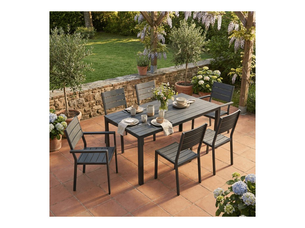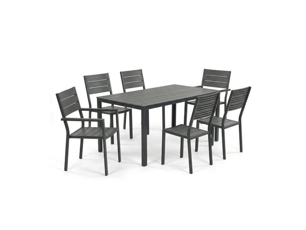 Kovový rám v šedém odstínu s práškovou povrchovou úpravou zajišťuje stabilitu a dlouhou životnost celé sestavy. Součástí je šest židlí, z toho dvě s područkami pro vyšší komfort a čtyři bez područek pro flexibilnější uspořádání a úsporu prostoru. Područky jsou rovněž z polywoodu, což podtrhuje jednotný vzhled setu.
