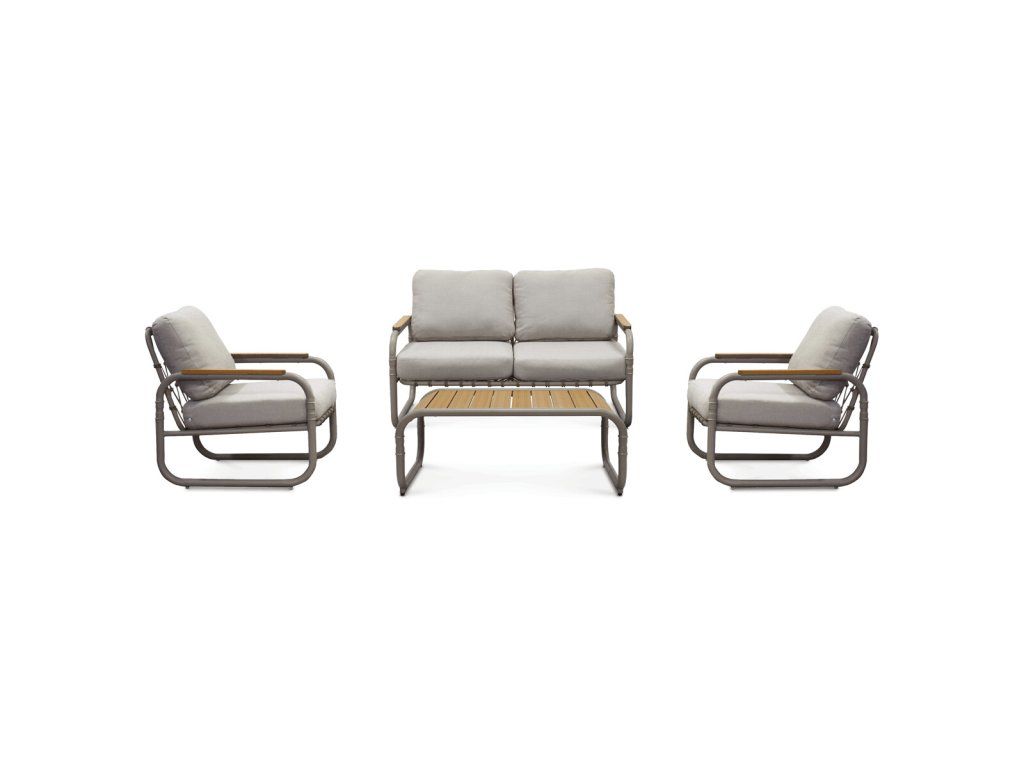 Sestava obsahuje dvě křesla a pohovku s područkami, které zajišťují komfortní posezení, a dále praktický stolek s deskou v přírodním odstínu, který doplňuje celkový design. Kovová konstrukce s práškovou povrchovou úpravou zvyšuje odolnost proti korozi a zajišťuje stabilitu celé sestavy.