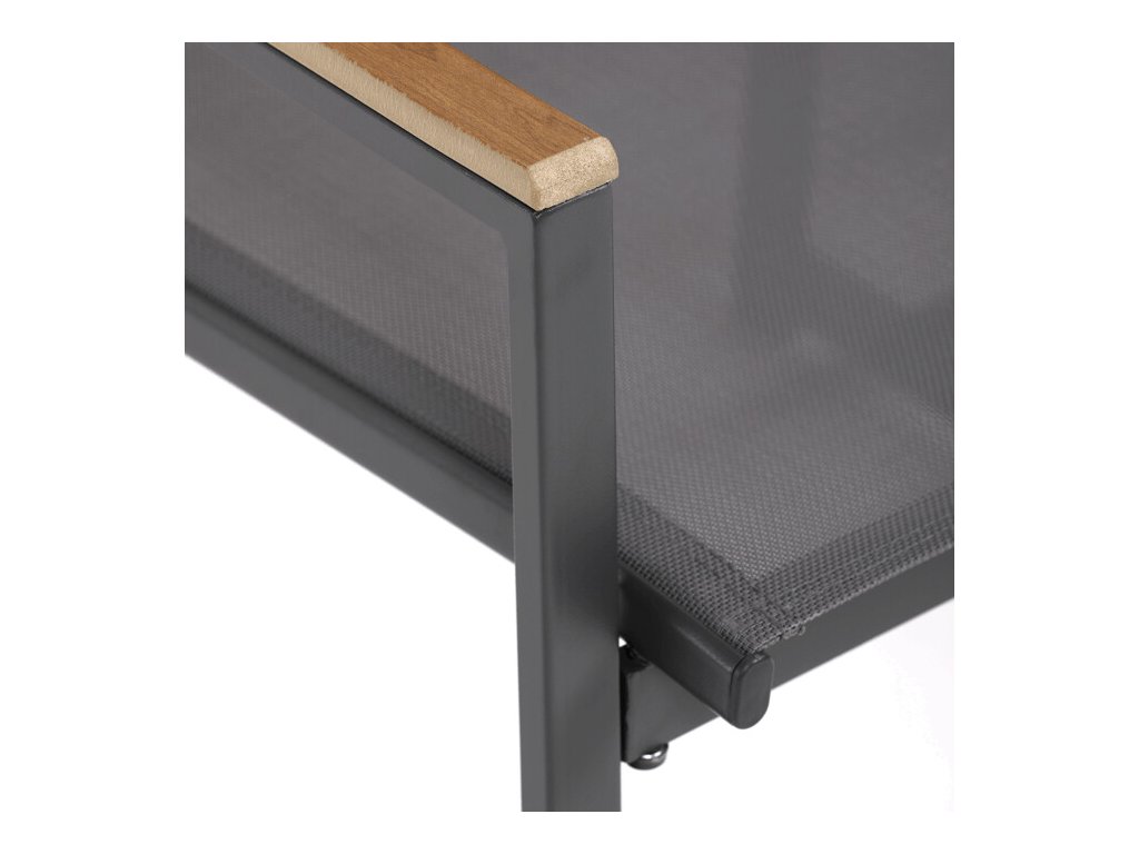 Stolová deska je vyrobena z černého tvrzeného skla, které je odolné vůči povětrnostním vlivům a snadno se udržuje. Polywoodové prvky na područkách dodávají sestavě přírodní akcent a zároveň zvyšují pohodlí při opření rukou.
