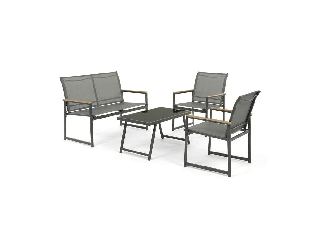 Zahradní set AZS-S1212 GREY v šedém provedení kombinuje pevný kovový rám s pohodlným textilním potahem sedáků a opěradel, který zajišťuje komfortní posezení při relaxaci na zahradě nebo terase.