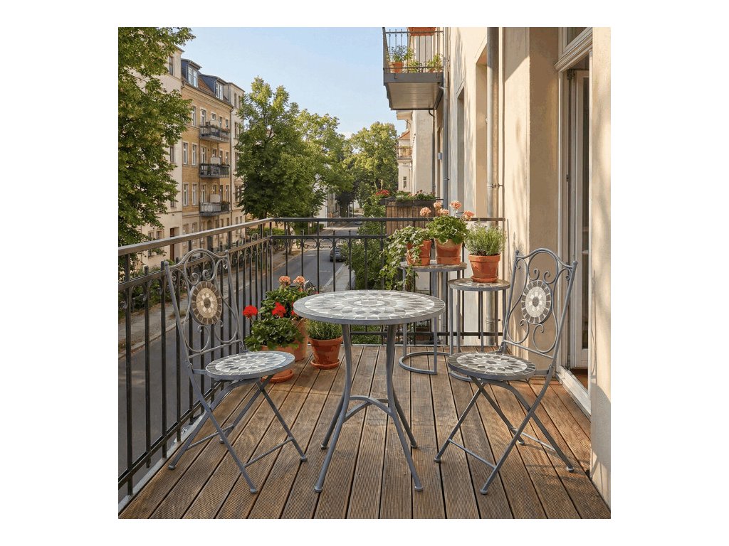 Díky kompaktním rozměrům je set ideální pro balkóny, menší terasy či zahradní kouty, kde poskytne pohodlné posezení pro dvě osoby.