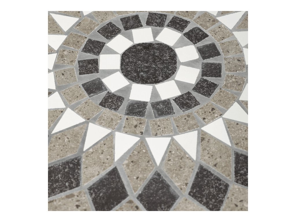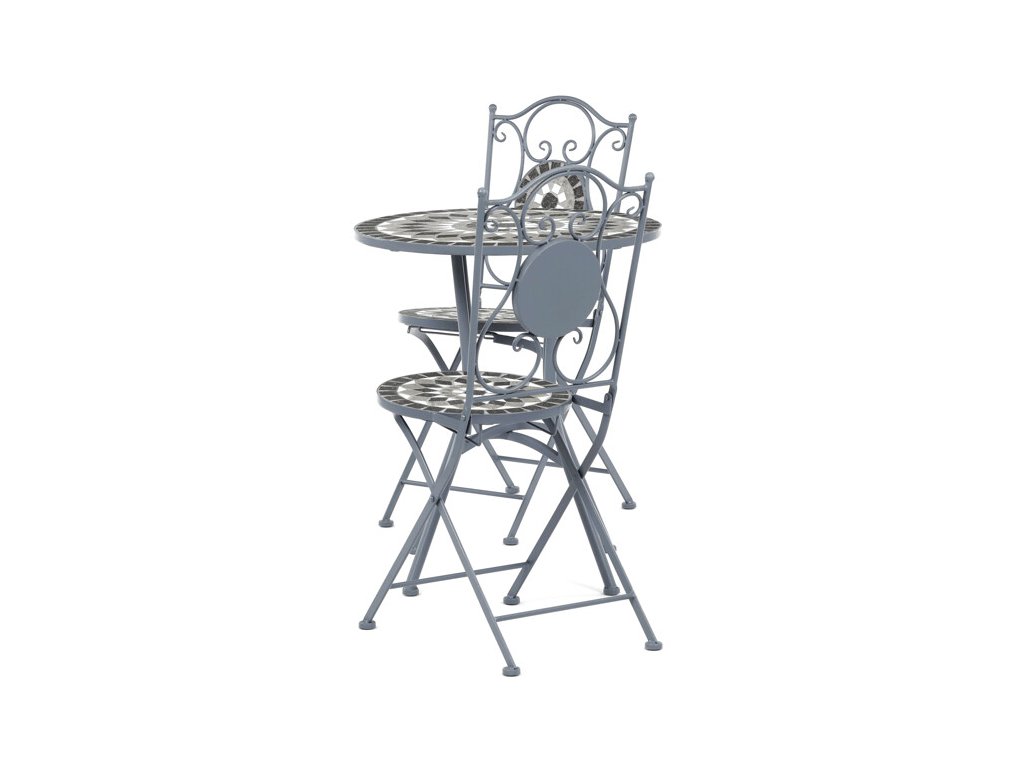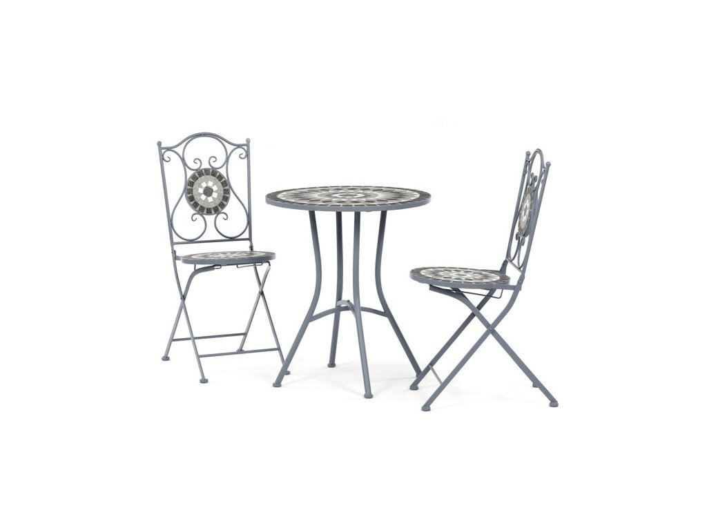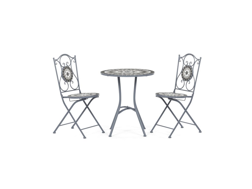Zahradní set US1500 se skládá z kulatého stolu a dvou židlí s dekorativní keramickou mozaikou v šedých odstínech. Mozaikový povrch je nejen vizuálně atraktivní, ale také odolný a snadno udržovatelný.