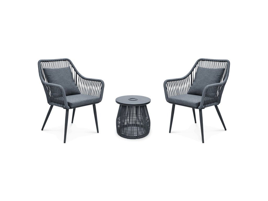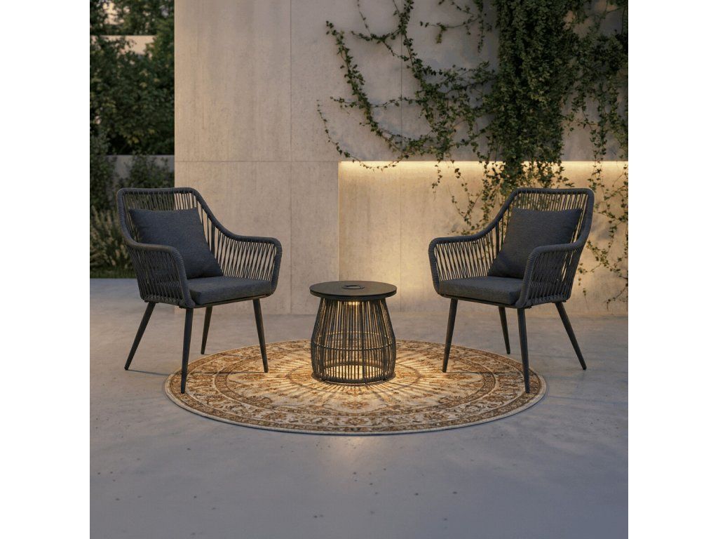 Unikátním prvkem je solární podsvícení stolku, které vytváří příjemnou atmosféru při večerním posezení a zároveň je energeticky úsporné. Stabilní konstrukce zajišťuje bezpečné a pohodlné používání při každodenní relaxaci. Set je ideální pro terasy, zahrady i balkony, kde nabídne stylové a funkční řešení pro odpočinek.