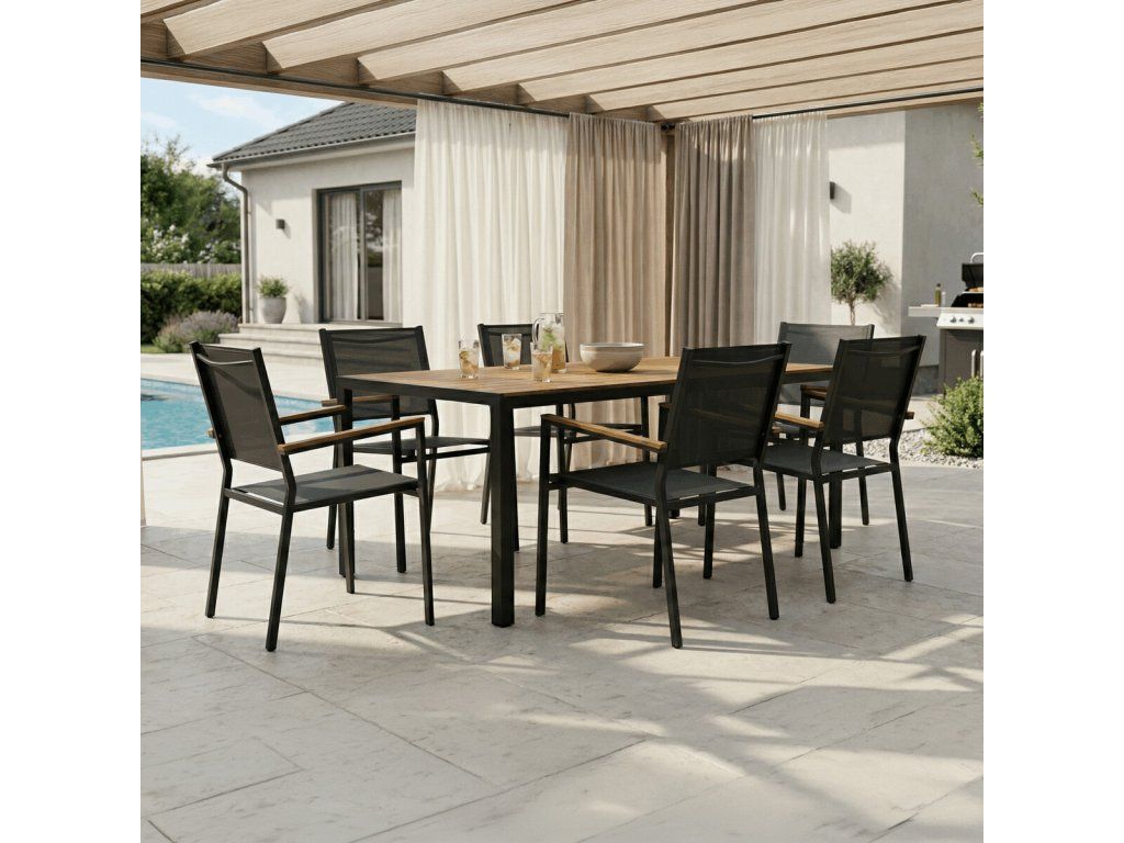 Jednoduchý a funkční design umožňuje snadné začlenění stolu do různých zahradních i terasových aranžmá. Díky praktickým rozměrům je vhodný pro rodinné i společenské posezení.