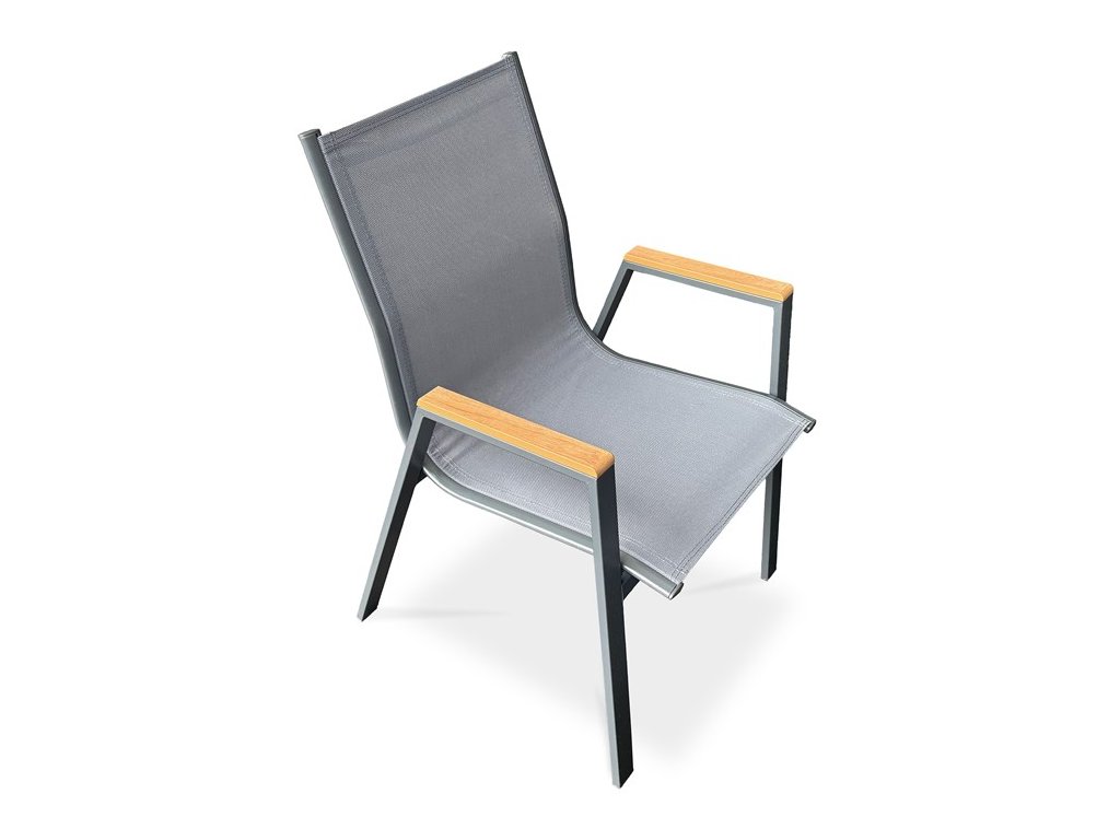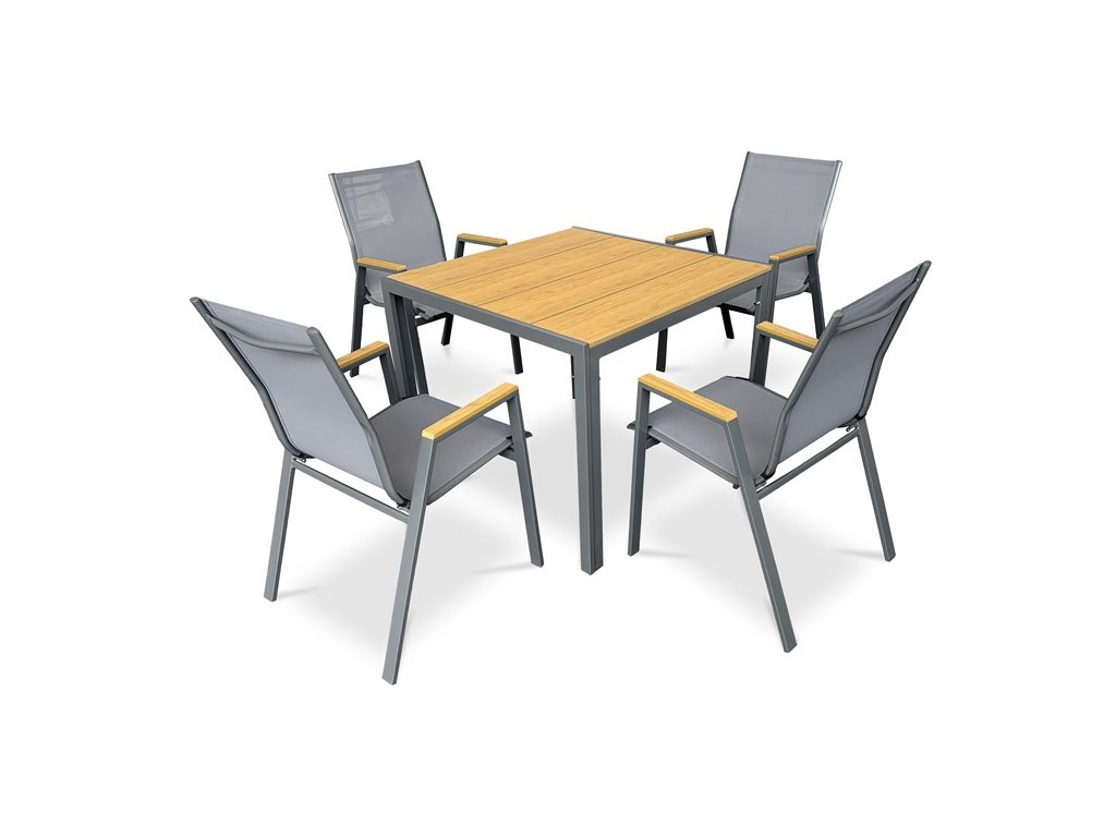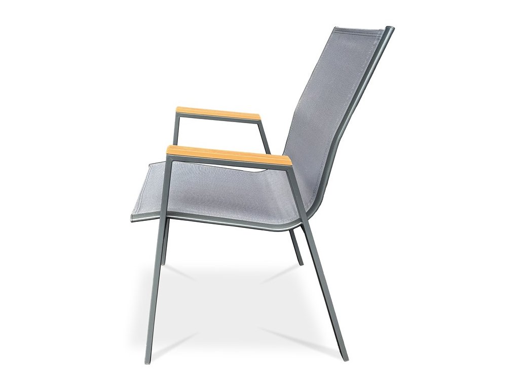 Pevná kovová konstrukce s práškovou povrchovou úpravou zaručuje odolnost vůči vnějším vlivům. Polywoodové područky dodávají přírodní akcent, který krásně kontrastuje s minimalistickým designem. Bez nutnosti montáže je židle ihned připravena k použití, což oceníte při rychlém zařizování venkovního prostoru. Skvěle se hodí k venkovním stolům na terase nebo zahradě.